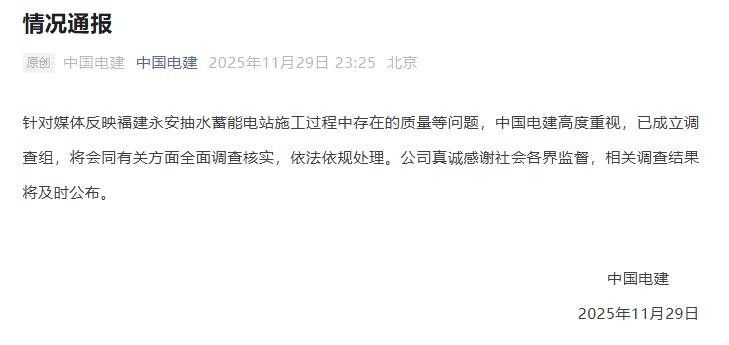 央视网消息:据中国电建官方微信公众号消息,11月29日晚,中国电建发布情况通报。继媒体报道福建永安抽水蓄能电站建设过程中存在的质量等问题后,中国电建高度重视,成立了调查组。在与有关各方充分调查核实后,我们将依法依规采取行动。我们对社会各界的指导表示衷心感谢,并将公布相关结果。及时进行调查。